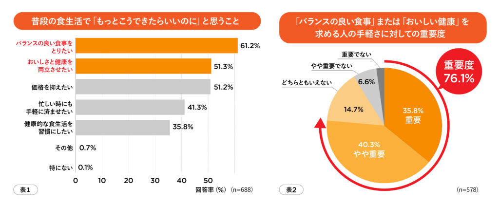 近年、はたらく世代の食生活が多様化するなか、健康や栄養バランスを意識した食事への関心が高まっています。弊社の調査(*1)によると、普段の食生活で「バランスの良い食事をとりたい」と思う方は全体の61.2%、「おいしさと健康を両立させたい」と考えている方が51%いることがわかりました。(表1)