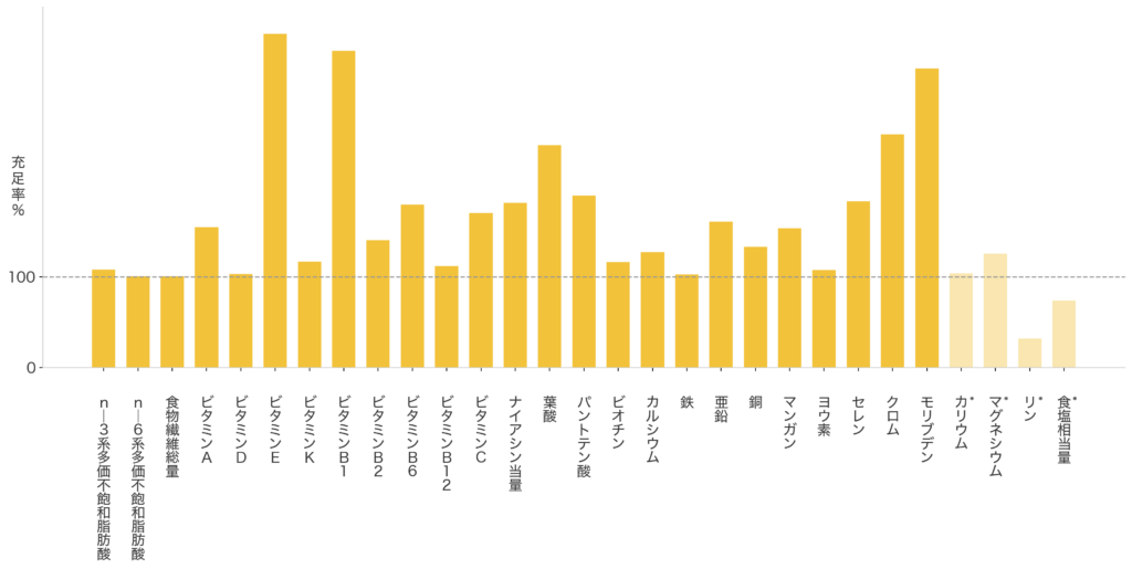 ※「日本人の食事摂取基準(2025年版)」30~49歳男女のどちらか高い方の基準に基づいた、1日分の基準値の1/3量を100%に設定