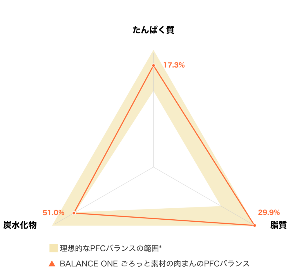 BALANCE ONE「ごろっと素材の肉まん」のPFCバランスと、理想的なPFCバランスを比較した図